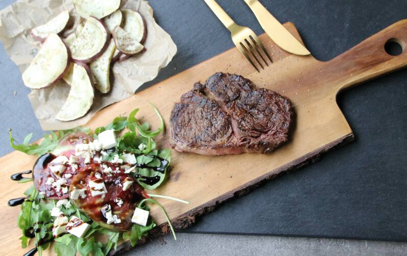 Ten slotte gaan we de rib-eye steak bakken. Smelt een lekker stuk roomboter in de pan (grilpan geeft het mooiste effect). Zorg dat de pan goed warm is. Zet de pan vervolgens wat lager en bak de steak aan beide kanten 3 minuten mooi bruin. Laat de steak na het bakken nog 2 minuten rusten in aluminiumfolie.